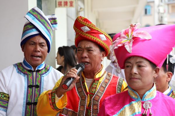 在广西民协文艺志愿服务基地挂牌仪式上,盛装的群众唱起山歌。