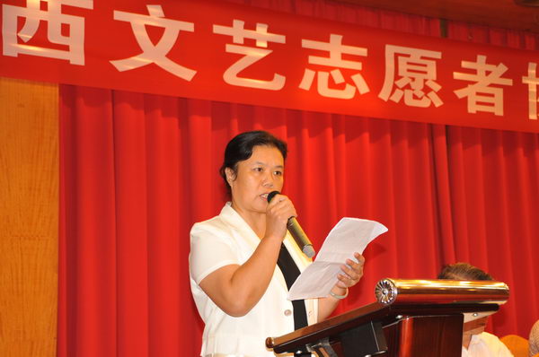 广西文联党组书记、主席韦守德在成立大会上讲话。他说,广西文联高度重视文艺志愿服务工作,党组成员带头参与,亲自组织,在开展活动的内容和形式上都进行了不断的创新,注重取得实效。广西文艺志愿者协会的成立是一次在全区范围内、在全区文联系统推动文艺志愿服务工作的再动员、再促进,希望各级文联组织和社会各界大力支持协会开展工作,希望广大文艺家和文艺工作者广泛参与文艺志愿服务活动。韦守德对广西文艺志愿者协会的建设与发展提出了殷切希望。他衷心希望协会要始终把文艺惠民作为根本宗旨,使文艺志愿服务深入民心。深刻把握文艺志愿服务公益性、实效性、社会化的定位,广泛动员广大文艺家和文艺工作者到艰苦地区、贫困地区、边疆地区、少数民族地区去,到最基层、最困难、最需要文化艺术的群众中去,让广大群众分享高品质的文艺成果,精神上得到温暖、愉悦和鼓舞,同时让文艺志愿服务成为广大群众心中翘首以待、文艺家和文艺工作者争相参与的活动。衷心希望协会要充分发挥职能,在文艺工作担当更重要的角色。继续坚持开展“送欢乐、下基层”和实施“千村万户文艺惠民工程”等文艺惠民活动,充分了解基层群众和文艺家的实际需求,深刻把握文艺志愿服务的特点,根据不同区域、不同群体的文化艺术需求,要创建一批文艺志愿服务长效基地,培育一批文艺志愿服务示范团队,推广一批文艺志愿服务品牌项目,组织开展多层次的文化惠民服务活动。衷心希望协会要敢于创新,勇于担当,加强协调,为文艺志愿服务提供强有力的组织保障。积极推动各全区文艺家协会分会和各级文联组织建立文艺志愿者协会,逐步建立覆盖广泛、上下联动、规范有序的实施网络和文艺志愿者招募、管理、评价、激励等工作机制,加强文艺志愿服务理论研究和宣传工作,积极争取党政和社会各界支持,努力完善文艺志愿服务的各项工作制度,提升文艺志愿服务的社会影响力,促进文艺志愿服务事业持续发展。