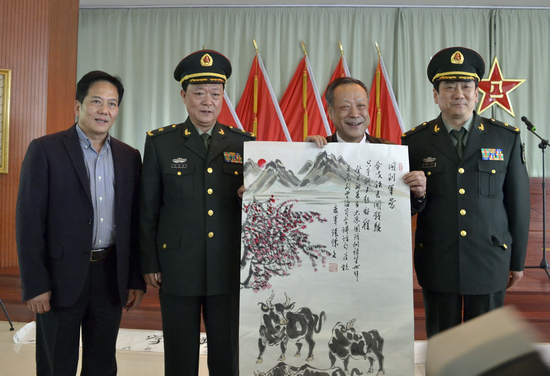 由省美协王学辉、孙海青、郝向炫、刘彩军、任晓军、乔亚丁、徐晋平、董志敏、李桂平、高雪涛共同创作了一幅精品——“春色满园”百花迎春图把现场气氛推向了高潮。牡丹花的雍容与富贵、娇艳和大气,玉兰花在一片绿意盎然中开出大轮的白色花朵,令人感受到一股难以言喻的气质,委实清新可人,这幅花鸟韵味的国画春情洋溢,给官兵们带来了春天般的希望。