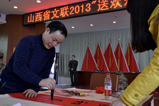 山西省政协常委、省文联党组书记、省书协副主席张根虎表示,“送欢乐、下基层”是山西文联常年开展的一项重要文化品牌活动,是一项深受群众欢迎的公益性惠民文化活动,是一项得民心、顺民意、惠民生的重要活动,也是推进文化大发展大繁荣的实际举措。此次慰问活动也是“走基层、转作风、改文风”的具体行动,是落实党的文化惠民政策的生动实践。相信我们的艺术家通过这次慰问活动,一定能够更加密切与广大官兵的血肉联系,加深与广大官兵的鱼水深情,为广大官兵送上精彩纷呈的文化盛宴,丰富和活跃广大官兵节日文化生活,努力为人民放歌、为人民抒情、为人民祝福,努力营造欢乐祥和、喜庆文明的节日氛围。