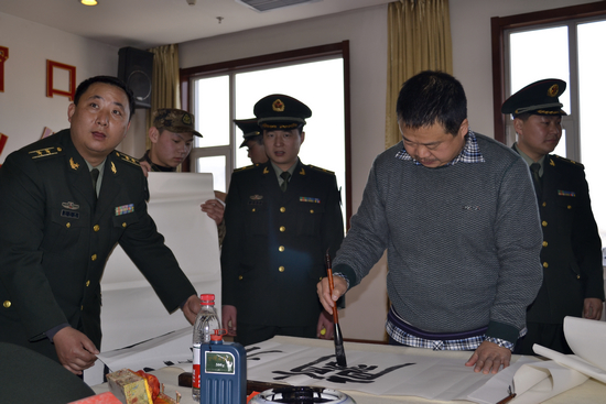 简短的仪式结束后,由省文联主席、省书协名誉主席李才旺同志为活动开笔,那饱含真情、苍劲刚健的“鱼水情深”,拉近了官兵们和艺术家们的距离,表达了艺术家们对广大官兵的崇敬之情。书画家们随即投入了紧张的创作中,此时,几乎每位艺术家的案桌前都被官兵们“团团围住”,有些甚至排起了长队。官兵们自选对联内容,然后由艺术家题写。“福星高照全家福、春光耀辉满堂春”、“小康家庭欢乐日、春回大地艳阳天”……一副副对联寄托着广大官兵美好的愿望,也凝聚着艺术家们对战士们的浓浓情意。