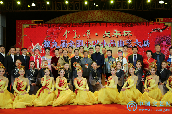 11月12日,由中国民间文艺家协会指导,中国文联民间文艺艺术中心、中国民间文艺家协会民间戏曲艺术委员会、合肥市文化广电新闻出版局和长丰县人民政府共同主办的“中华颂·长丰杯”第九届全国小戏小品曲艺大展在安徽省合肥市长丰县开幕。图为演出结束后合影。中国文艺网 刘青摄