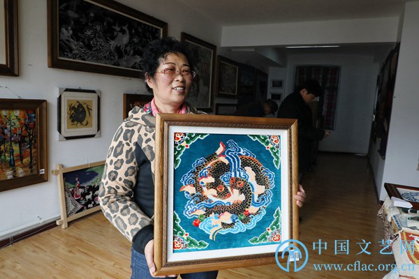 青海省唯一掌握高道数手工丝毛挂毯绝技的工艺大师汪巧银展示亲手制作的丝毛挂毯。中国文艺网 白伟 摄