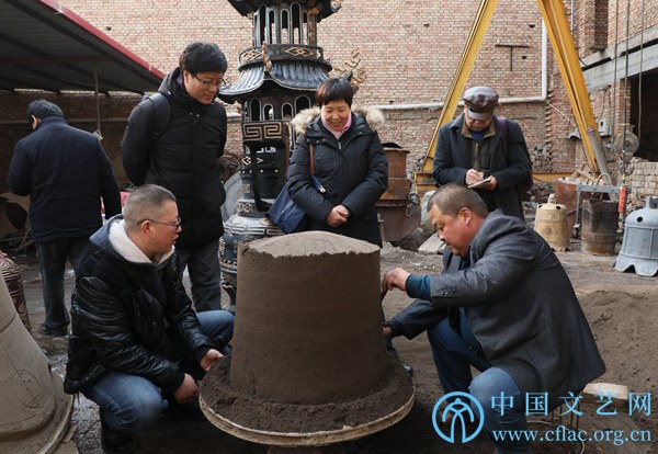 民间文艺学者一行调研西宁市非遗项目代表性传承人李尚奎的西纳川铸钟技艺。中国文艺网 白伟 摄