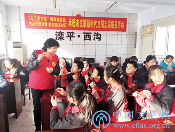 2021年12月,承德市文联开展“文艺进万家健康你我他”——传承非遗力量、助力脱贫攻坚新时代文明实践文艺志愿服务活动,图为文艺志愿者为孩子们传授传统剪纸艺术。