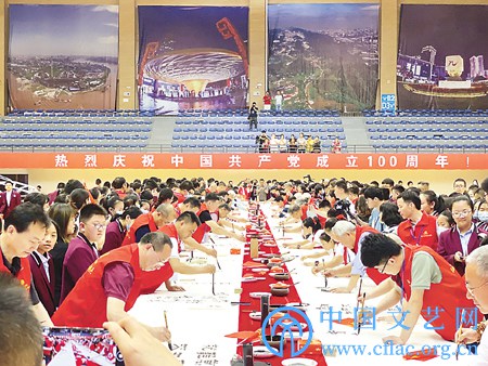重庆市书协——2021年5月,“百米长卷书丰碑”重庆市庆祝建党一百周年百人现场书写活动在杨家坪中学彩云湖校区举行。