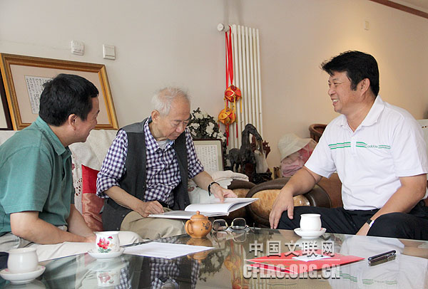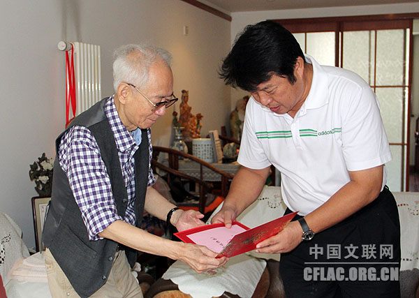 9月1日,中国文联党组副书记、副主席覃志刚在中国文联办公厅副主任刘尚军等陪同下来到中国文联荣誉委员、中国书协荣誉主席沈鹏家中,代表中国文联党组为沈鹏80岁生日送上祝福和生日礼物。图为覃志刚向沈鹏赠送生日贺卡。中国文联网 董大汗 摄