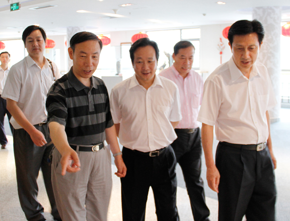 7月25日,中国文联领导接见湖北省文联一行。图为湖北省委常委、宣传部部长尹汉宁一行在中国文联办公厅主任夏朝华的陪同下,参观中国文艺家之家。 中国文艺网 刘刈 摄
