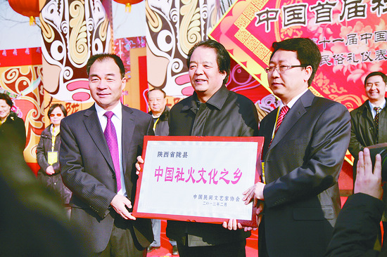 王勇超(中)向陇县授予“中国社火文化之乡”牌匾