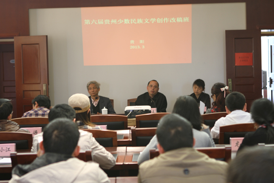 3月29日,由贵州省作协组织举办的第六届贵州少数民族文学创作改稿班在贵阳市委党校开班。贵州省文联副主席欧阳黔森出席改稿班并作讲话。改稿会由贵州省作协副秘书长、贵州文学院常务副院长孔海蓉主持。鲁迅文学院第二期少数民族文学创作培训班的全体学员等40余人出席改稿班。