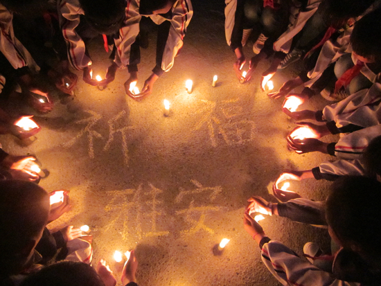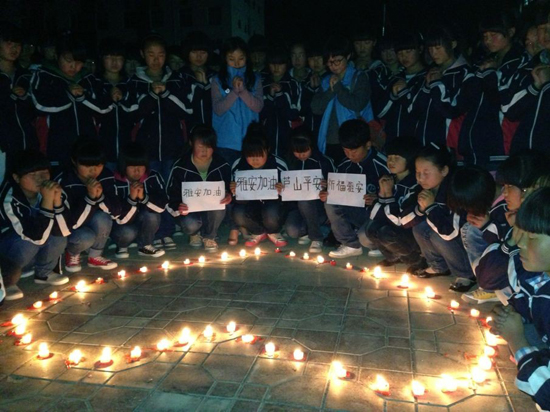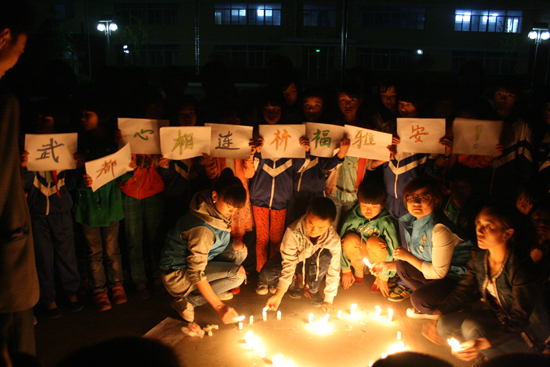 4月20日8时02分,四川省雅安芦山发生里氏7级强震,甘肃武都地区震感强烈。中国文联文艺志愿服务中心组织开展的文艺支教活动正在在武都进行,地震发生那一刻起,支教文艺工作者的的心就紧紧和雅安地震灾区的人民连在了一起……4月21日晚8点02分,陇南市武都区马街小学、两水中心小学、安化初级中学的中国文联文艺支教文艺工作者与当地师生一起点燃蜡烛,写下“雅安平安”、“雅安坚强”、“雅安,我们和你在一起”,并集体沉默哀悼3分钟,为受灾群众祈祷平安,希望他们顺利度过灾情,重建美丽家园。