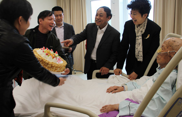 4月23日下午,中国文联党组书记、副主席赵实,党组成员、书记处书记夏潮,中国影协分党组成员、副秘书长谢力等看望百岁影人于敏,并庆贺他的百岁寿诞。图为赵实、夏潮等送上蛋糕。中国文艺网 吴月玲 摄