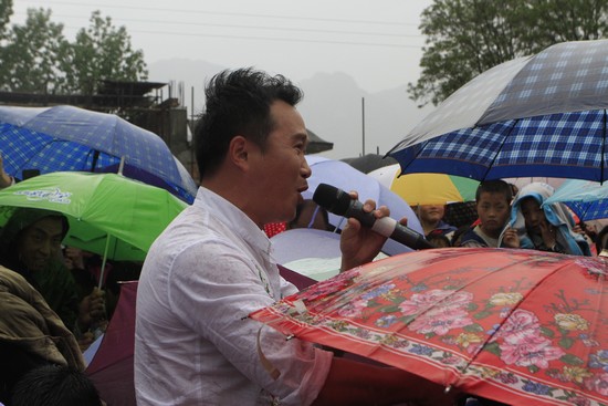送欢乐下基层唐坪村演出现场,演员在雨中为村民演唱 中国文艺网 白伟 摄