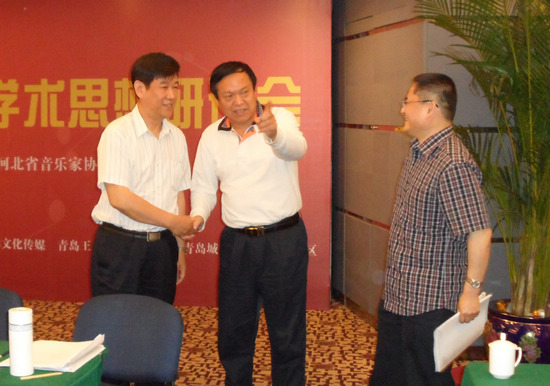 山东省文联党组成员、副主席、音协主席张桂林(左),中共城阳区委常委尹世逸(中),山东省音乐家协会副主席刘新海在研讨会上的留影 孟祥宁 摄