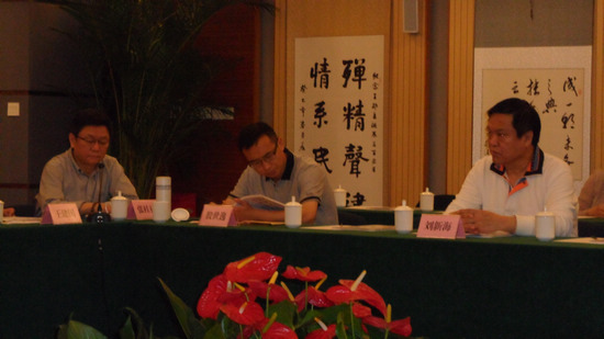 山东省音乐家协会副主席刘新海向中国艺术报社社长、中国文联文艺资源中心主任向云驹(右),中国音协分党组成员、副秘书长王建国(左)介绍有关律历学家王邦直的情况 孟祥宁 摄