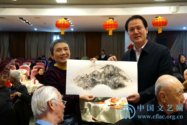 1月2日,2020年中国文联老同志新春团拜会在中国文艺家之家举办,中国文联党组书记、副主席李屹,中国文联党组成员、副主席李前光、陈建文,中国文联党组成员、书记处书记董耀鹏等出席。图为中国文联党组书记、副主席李屹为老同志颁发新春团拜会吉祥物。中国文艺网 邱茗 摄