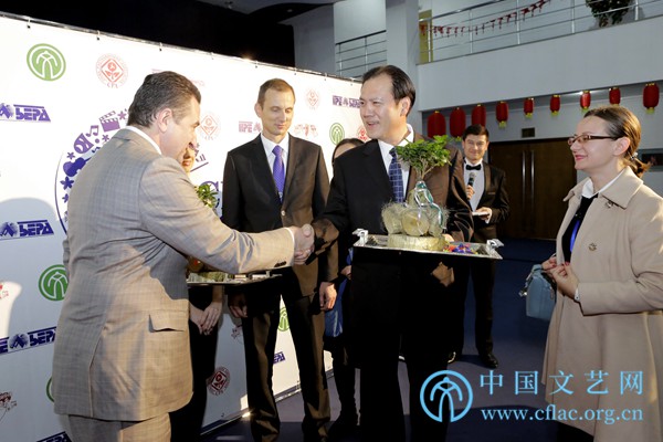 10月31日,2018“今日中国”艺术周在俄罗斯克拉斯诺达尔边疆区举行。图为中国文联党组成员、副主席李前光接受欢迎仪式。