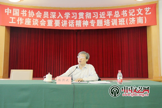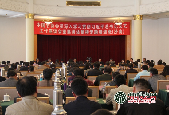 4月12日,中国书协深入学习贯彻习近平总书记文艺工作座谈会重要讲话精神专题培训班在山东济南开班,拉开了中国书协会员培训的大幕。此次培训班是按照中央统一部署,贯彻落实中宣部、中国文联等联合印发的《2016 - 2017年全国文艺骨干和管理干部培训工作规划》的要求和《中国文联关于各全国文艺家协会会员培训实施方案》 、中国文联九届八次全委会工作部署的重要举措,旨在引导广大书法家和书法工作者深刻领会党中央关于文艺工作和文联工作的重要指示精神,充分认识新时期书法工作的历史定位、重要意义、面临形势、独特优势和任务挑战,做到学深讲话原文、领会讲话原义、悟透讲话原理,提升推动书法事业发展的政治自觉、思想自觉和行动自觉。