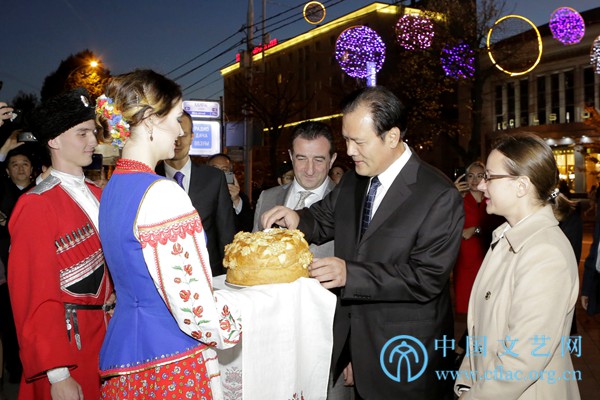 10月31日,2018“今日中国”艺术周在俄罗斯克拉斯诺达尔边疆区举行。图为中国文联党组成员、副主席李前光接受欢迎仪式。