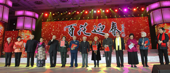 金蛇狂舞,百花迎春。1月13日下午,北京人民大会堂宴会厅群星闪耀、欢声阵阵,由中国文联主办的“百花迎春——中国文学艺术界2013春节大联欢”在这里成功录制,将于春节期间在央视播出。中共中央政治局委员、国务委员孟建柱,全国政协副主席、中国文联主席孙家正出席观看演出。中国文联党组领导赵实、覃志刚、李屹、杨承志、左中一、夏潮、李前光,以及有关部委领导,中国文联在京副主席、荣委、老领导、文艺界代表等也观看演出。