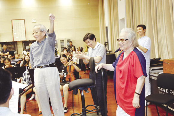 郭淑珍此次亲自担任总策划和艺术总监,并亲力亲为带领中央音乐学院声歌系和管弦系学生排练《黄河大合唱》 。从6月开始,排练工作就已如火如荼地进行,为了能让“90后”的年轻学生更加深入地理解这部恢弘的音乐史诗作品,郭淑珍特意请来了著名指挥家,已是92岁高龄的严良堃来学院指导排练。严老不顾年事已高,连续4周来到中央音乐学院指导中国青年交响乐团和声歌系合唱团排练,两位老人颇有激情的示范指导,深深打动了参与其中的许多年轻人。