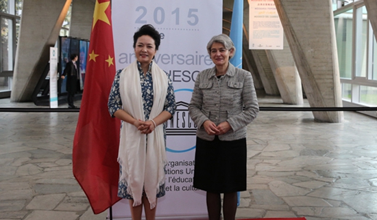 11月30日,国家主席习近平夫人彭丽媛应邀参观巴黎联合国教科文组织总部,受到联合国教科文组织总干事博科娃的热情迎接。 新华社发