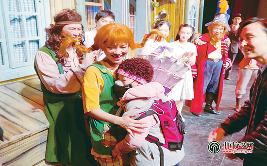 《皮皮·长袜子》演出后,唐妍与白血病女孩欢欢拥抱