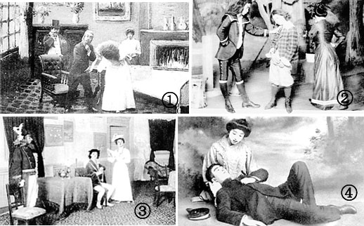 无独有偶,潘家园发掘出春柳社首演《茶花女》的两张剧照明信片珍品不久,国内民间又“出土”了一批记录春柳社随后几次演出的剧照老明信片,而且数量达八枚之多。真可谓献给中国话剧百年的一份难得礼物。当初春柳社同人受《茶花女》上演成功的鼓舞,随即根据林琴南翻译美国斯托夫人的长篇小说《黑奴吁天录》(原名《汤姆叔叔的小屋》)改编成五幕新剧《黑奴吁天录》,于同年6月1日、2日在东京颇有名气的剧场本乡座上演了两场,非常成功,引起日本戏剧界的轰动。继《黑奴吁天录》后,春柳社在1908年上演了《相生怜》、《新蝶梦》等多幕剧;次年初,又上演了《鸣不平》等剧;1909年初上演了四幕剧《热泪》,以后还上演了《金色夜叉》、《不如归》等剧。这次从民间发现的八枚明信片,图案都是上述这些早期春柳社演出剧目的黑白剧照(图2《黑奴吁天录》剧照、图3《热泪》剧照、图4《金色夜叉》剧照),制作者是东京银座上方屋,虽历经百年,保存却很完好,画面也十分清晰。一次发现如此多的中国话剧早期图像文献,前所未有,其文献价值不言而喻。