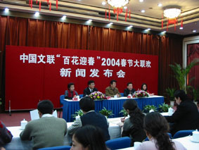 中国文联“百花迎春”2004春节大联欢新闻发布会会场。余宁/摄