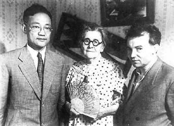 1954年,巴金在前苏联雅尔达的契诃夫故居,同契诃夫妹妹玛丽亚·契诃夫及罗马尼亚诗人米哈依·别纽克合影。