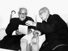 1985年3月27日,巴金(左)看望91岁的叶圣陶。叶老拿出亲自审定的《叶圣陶散文甲集》,赠送老友。