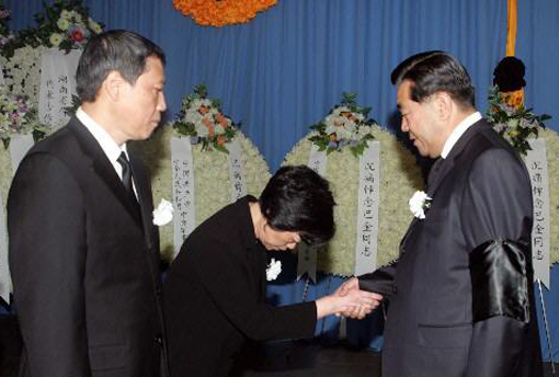 下午约2时,贾庆林、陈良宇、陈至立、刘延东在哀乐声中缓步来到巴金遗体前肃立默哀,向巴金遗体三鞠躬,并与亲属一一握手。贾庆林转达了胡锦涛总书记等中央领导同志对巴金亲属的深切慰问。