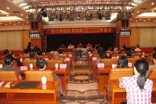 潘琦在欢送会上讲话。他说,即将举行的文艺界两大盛会,将认真学习会议报告,并产生新一届的领导班子,作为广西代表团的成员,一定要展示出广西文艺家的风貌、风格、风采,务必做到:顾大局、识大体,与党中央保持高度一致;共同做到讲团结、守纪律;要重学习善交流。