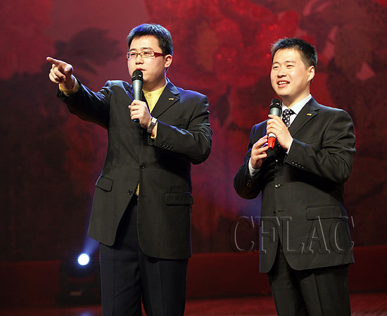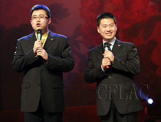 中国曲协甄齐(左)和石景山文化馆李然表演相声《智力测验》
