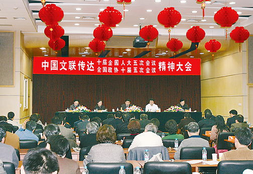 3月22日,中国文联召开大会,传达学习十届全国人大五次会议和全国政协十届五次会议精神。会议强调,中国文联及各文艺家协会、直属单位和机关各部室要认真学习贯彻全国“两会”精神和胡锦涛总书记在出席全国政协工青妇联组会议上的重要讲话精神,统一思想、振奋精神,开拓进取、扎实工作,团结带领广大文艺工作者共建共享和谐社会,以过硬的素质、优良的作风、奋发有为的精神状态,履行好党和人民赋予的神圣职责,努力创造一流的工作业绩,以实际行动迎接党的十七大的胜利召开。