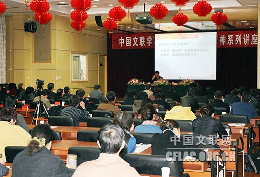 中国文联学习贯彻党的十七大精神系列讲座11月20日举办第二讲。中国文联党组副书记、副主席李牧,党组成员、副主席冯远,党组成员、主席团委员廖奔、白庚胜和中国文联各文艺家协会、各直属单位、机关各部室负责人、专职党务干部等聆听了由中央党校文史教研部副主任周熙明所作的《洞察文化的本质性力量