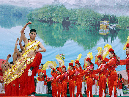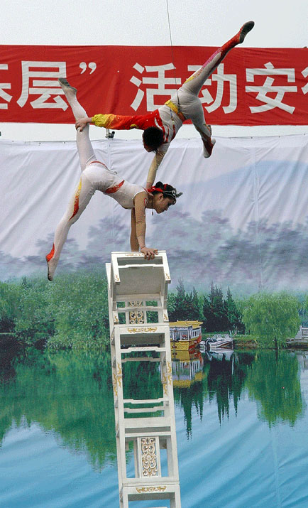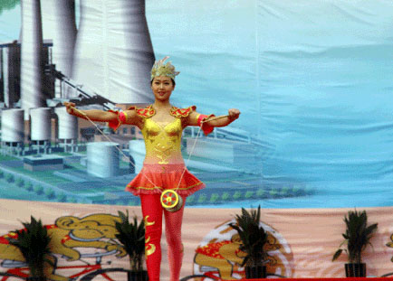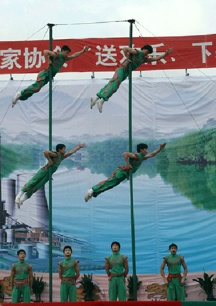 演出在现场观众的热情期盼和阵阵礼炮声中正式开始,开场由东道主宿州送上极具特色的地方戏花鼓灯舞蹈表演,小伙子和大姑娘们一舞舞出了宿州经济发展、人民幸福快乐的心情。本地戏的精彩表演引出了后面的串串珠玉。豫剧《抬花轿》、滑稽戏《摄影爱好者》、口技、歌曲《草原上升起不落的太阳》、杂技《跳板蹬人》、《转台高椅》····一个赛一个,精彩纷呈,让台下的观众看的直带劲。看到有些高难度的动作时,台下都悬着个嗓子,诺大的体育场便只有音乐声飘扬,有时甚至得等到一个节目结束,观众们才敢放开手来用力鼓掌。