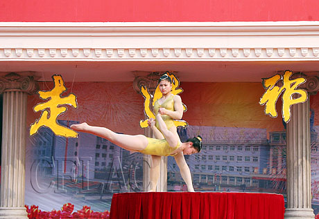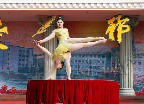 上海马戏学校戴文娟和陈佳伟在祁南煤矿表演杂技《力量》