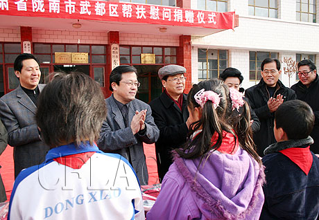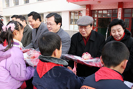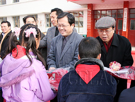 冯远向东江小学的孩子们赠送糖果和文具