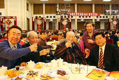 胡振民向著名老艺术家欧阳山尊、马少波、吕厚民(右起)祝酒。中国文联网 康伟/摄