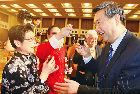 李从军向著名老艺术家夏菊花、贾作光、于洋(左起)祝酒。中国文联网 康伟/摄