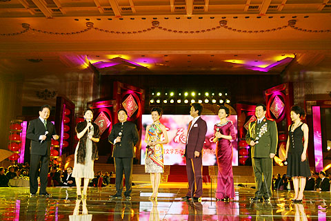 主持人:瞿弦和、杨澜、姜昆、周涛、朱军、董卿、黄宏、王小丫(从左至右)中国文联网 余宁/摄