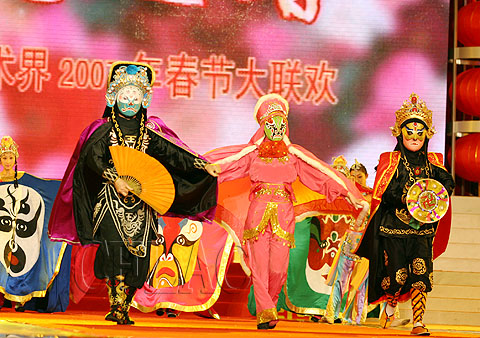 何洪庆、于丹和陈徐表演川剧《变脸》。中国文联网 余宁/摄