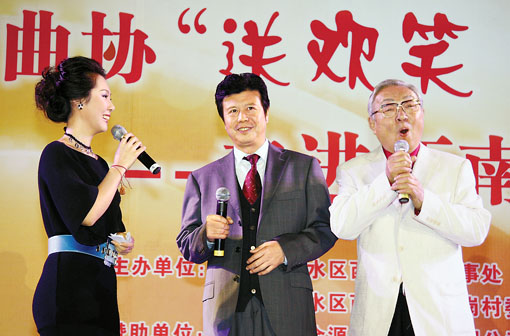 第二天一大早,义演小分队又驱车赶往佛山市顺德区美的集团工业园区,为数千名美的员工做慰问演出。演出之前天有点阴,中途又突然下起雨来。虽然天公不作美,但广东人却认为能带来风雨的人都是吉祥的人,数千名美的员工身披塑料雨衣,兴致勃勃地观看艺术家们的精彩演出。广州军区战士文工团13岁的小演员姜何表演的杂技《小小阿里郎》惊险刺激,令观众大声喝彩,种玉杰、唐杰忠、崔喜跃、黄俊英、何宝文、于海伦、张文甫、李伟群等演员冒雨演出,赢得大家的热烈掌声。刘兰芳本来已经表演了一个大段的评书节目,在观众的要求下又冒雨加演了一段,现场观众无不为艺术家们的敬业精神所深深感动。此时,雨越下越大,当姜昆与戴志诚精神抖擞地为大家表演相声时,台下一位年轻的女观众实在不忍心看到自己敬重的艺术家冒雨表演,跑上台来送上自己的雨伞。紧接着,又有观众先后上台献花,这时,善于“现挂”的姜昆笑言:“花儿都给我吧,您瞧,小戴哪还能腾出手来呀!”观众的热情强烈感染着台上的演员,最后两人索性把雨伞和花束都放在一边,淋着雨又为大家表演了一段。一位美的员工在接受采访时动情地说:“以前都是在剧场看演出,像这样把歌声、笑声送到我们厂区,送到我们身边的演出还是第一次,尤其是能与这么多来自北京的著名艺术家这么近距离地接触,实在是太感动了,太开心了!”