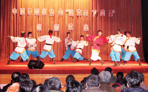 2007年12月28日一早,天空飘起了雪花,四五级的大风一个劲儿地吹,可是恶劣的天气阻挡不住中国舞协组织的“送欢乐下基层”演出队伍的热情。由中国舞协分党组书记冯双白带队,著名舞蹈演员山翀、苟婵婵、王盛峰,曲艺演员刘朝、宋德全、王玉以及中央民族大学舞蹈系的同学们,一起来到了北京市门头沟区雁翅镇青白口村,为乡亲们带来了精彩的文艺节目。