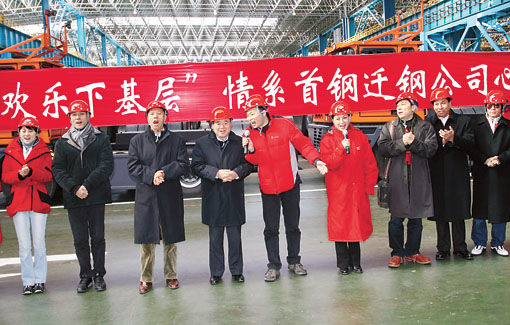 1月16日一早,慰问团就驱车奔赴首钢迁安钢铁公司,工人们早早就捧着鲜花在车间里等候。迁钢地处山区,没有供暖设施的车间里温度几乎和室外一样低,但艺术家们火热的心和工人们期盼的心相互温暖,歌声、琴声、笑声、欢呼喝彩声汇成了冬日里的暖流。艺术家们热情地进行表演,多才多艺的工人们也亮出自己的“绝活”。炼钢工程师陈德林演唱的京剧《吕布与貂蝉·小宴》则颇具名家派头,刘佳上前把工人献给自己的鲜花送到他手里。三期建设总指挥苏显华拉起京胡,带领工人组成的小乐队为李依晓伴奏,共同表演了京剧名段《苏三起解》。
