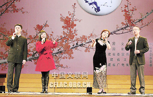 梅花奖艺术团首站演出来到了文化积淀深厚的长乐市。1月15日晚,长乐人民会堂灯火辉煌、笑语声声,由中国文联、中国剧协、福建省委宣传部、福建省文联和福建省广电集团联合主办的“送欢乐、下基层”——海峡西岸行长乐专场演出在这里举行。福建省政协副主席王耀华,中国剧协分党组书记董伟,福建省委宣传部副部长朱清,福建省文联党组书记范碧云等领导以及福建戏剧界代表、长乐社会各界代表共同观看了演出。梅花大奖获得者、中国剧协主席尚长荣和梅花奖得主以自己最拿手的剧目一展风采。经典唱段、戏曲绝活、美妙的歌曲和舞蹈使得整场演出喝彩声、叫好声不绝于耳。
