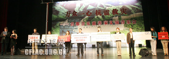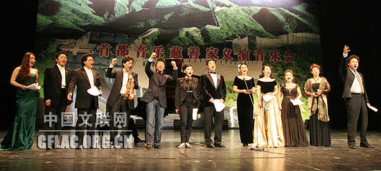 抗震救灾”首都音乐家慈善义演音乐会在解放军歌剧院举行。这台从策划到演出不足24小时的慈善义演阵容强大、群星璀璨,有郎朗、吕思清、戴玉强、范竞马、殷秀梅、吴碧霞、张也、金曼、尤泓斐等著名音乐家的倾力加盟,有特意从国外赶来参加演出的歌唱家张立萍、张建一等,还有得知义演消息后纷纷赶来剧场登台演唱的年轻歌唱家沈娜、王丽、张海庆等。3个多小时的演出,始终洋溢着激情与深情,演唱与演奏成为最好的仪式,以此向地震灾害中的骨肉同胞表达爱的致意。