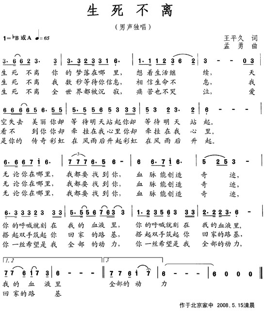 著名曲作家孟勇这几天来一直关注着灾情的发展。14日,他从电视上看到了词作家王平久为抗震救灾创作的词《生死不离》,被深深地感动了,于是开始为这首词谱曲,15日凌晨完成了《生死不离》的创作。就在本报即将付印时,记者接到孟勇的电话,他情不自禁地唱起了这首歌。据孟勇介绍,这首歌由青年歌手师鹏演唱,并于15日晚间录制完成