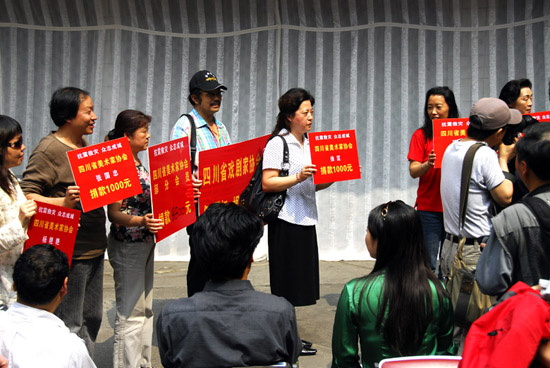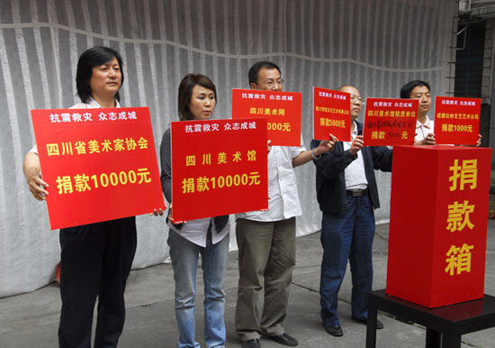 5月16日下午,四川省文联大院内人声鼎沸,四川文艺界“众志成城,万众一心”抗震救灾募捐活动举行。省文联机关和各协会的干部职工,离退休老同志,我省一批知名文艺家和各协会部分会员参加了捐赠活动。省文联党组副书记杨茂成主持活动,省文联党组书记黄启国作了简短的动员之后,数以百计的文艺工作者纷纷奉献爱心,踊跃捐款,半个小时左右共募集到近40万元的钱和物资(其中,现金31万多元,物资7万元)。省摄影家协会秘书长贾跃红代表协会全体会员捐款人民币10,000元,闻讯赶来的省摄协会员杨莉、孙有彬、李燊、李隆平、刘东、肖蜀成、胡世模、严华琼、包力、梁国静、贾跃红、何军、岳军、陆建华、沈波红、迟阿娟、王晓庄、高利等也以个人名义献了爱心。省文联将把这批捐赠尽快交到有关部门,用于抗震救灾,把我省文艺界的爱心送到灾区。